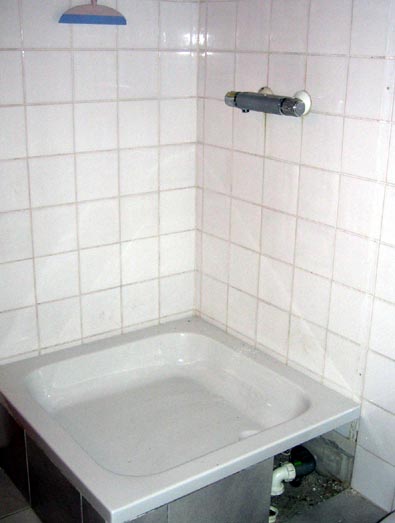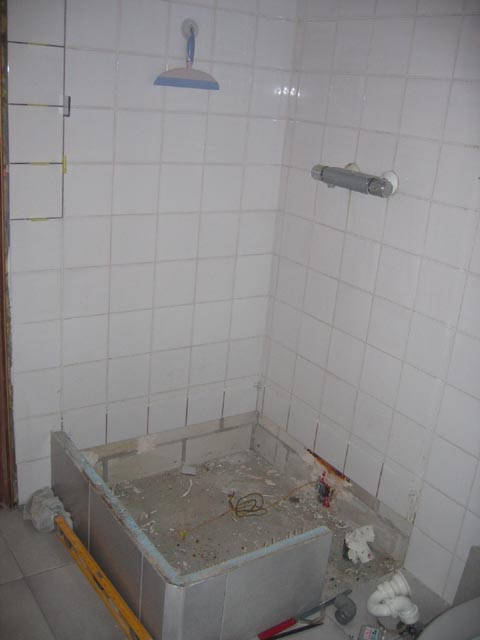 しかし、さすが、家を自分の手で建ててしまう大家さんだけのことはある。なかなかに難工事というか、古い床をばりッと剥がし、新しいのをドカッとはめ込み、下水管をよっこらせ、とつなぎ直すので、かなり面倒なはずなのですが。壁にも、シャワー室のドアを引っぺがした跡が痛々しく残っております。コレはちゃんと元通りになるのか?